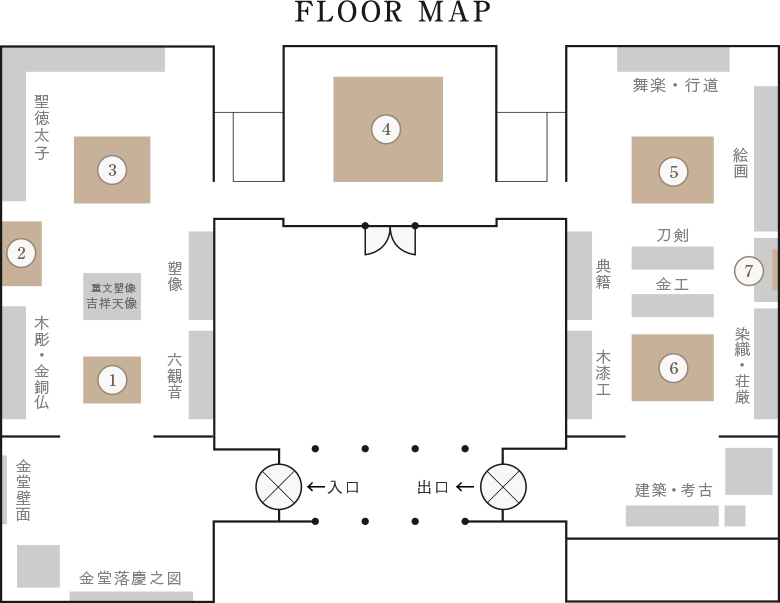 百済観音堂を中心に東西の宝蔵からなる大宝蔵院には法隆寺に伝来する数々の名宝が安置されています。中でも飛鳥時代の建築様式を伝える宮殿形の玉虫厨子は、周囲の金具の下に玉虫の翅があるのでこの名があります。このほか橘夫人念持仏と伝える精緻な光背と後屏を背に蓮池から出現した蓮華に座す阿弥陀三尊像をお祀りした厨子や、その優しげなお顔から悪夢を吉夢に替えてくださると伝える夢違観音像をはじめ、中国から伝えられた白壇造りの九面観音像・天人の描かれた金堂小壁画・百万塔など、上代文化の息吹を今に伝えています。