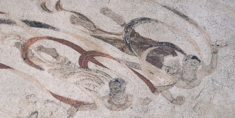 金堂内部の壁面は外陣の大壁四面をはじめ、内陣の小壁などすべてに壁画が描かれていましたが、昭和24年焼損してしまいました。写真の内陣「飛天図」は火災の前に取り外され、難を逃れました。内陣にあった20面の飛天図は同じ図様で、花皿を掲げ持った二体の天人が天衣を軽やかに翻して舞う姿が描かれています。