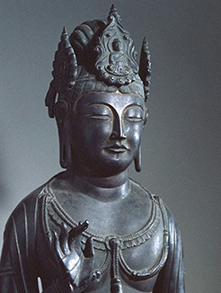 飛鳥彫刻を代表するこの像は像高209.4㎝。あたかも天を指すようなすらりと伸びた体躯に、優しく微笑みかける柔和な尊顔が華麗な光背に映え、見る人の心を惹きつけます。江戸時代には虚空蔵菩薩とされていましたが、明治に化仏のある透かし彫りの宝冠が見つかり、百済観音と呼ばれるようになりました。光背の支柱は竹を模して造られ、基部に山岳文が表現されています。