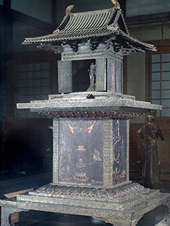 宣字形の台座上に置かれた宮殿部は錣葺(しころぶき)の屋根、精緻に造られた組み物等で仏殿の形に造られ、金堂より古い建築様式がみられます。唐草模様を透かし彫りした銅板とその下には玉虫の翅が貼られており、玉虫厨子(たまむしのずし)と呼ばれています。下部の台座には正面に舎利供養図、背面には須弥山世界図、また側面には釈迦の前世説話「捨身飼虎図」、「施身聞偈図」が描かれています。