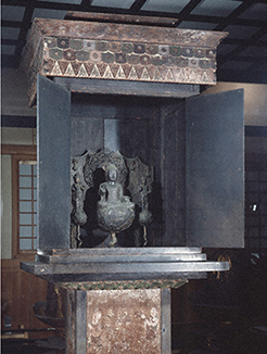 藤原不比等の夫人で、光明皇后の母である橘三千代の念持仏とされる厨子入りの阿弥陀三尊像。蓮池を表した銅造鍍金の台から螺旋状に立ち上がった三本の蓮茎の上に蓮華座が乗り、阿弥陀三尊像が安置されています。三尊の後の後屏は浄土の世界を見事に表現しています。