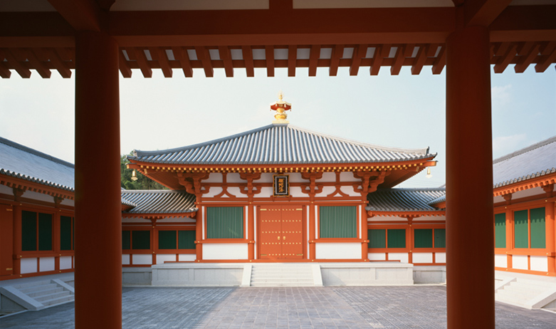 百済観音堂を中心に東西の宝蔵からなる大宝蔵院には法隆寺に伝来する数々の名宝が安置されています。中でも飛鳥時代の建築様式を伝える宮殿形の玉虫厨子は、周囲の金具の下に玉虫の翅があるのでこの名があります。このほか橘夫人念持仏と伝える精緻な光背と後屏を背に蓮池から出現した蓮華に座す阿弥陀三尊像をお祀りした厨子や、その優しげなお顔から悪夢を吉夢に替えてくださると伝える夢違観音像をはじめ、中国から伝えられた白壇造りの九面観音像・天人の描かれた金堂小壁画・百万塔など、上代文化の息吹を今に伝えています。