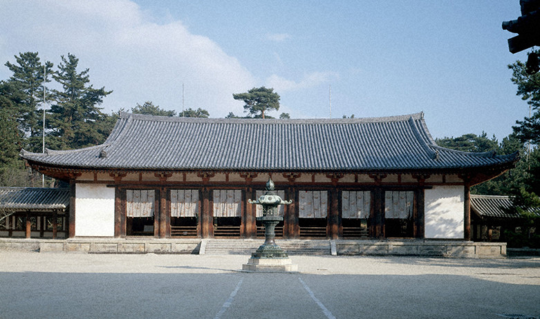 金堂と五重塔の北側に立つ間口九間の大講堂は、元は北側の廻廊の外に独立して建っていましたが延長3年(925)に焼失し、正暦元年(990)ほぼ元の規模と同じ大きさの堂々とした姿に再建されました。さらに廻廊を北側に延長してこれに取り付けたので堂の前が広く清々しい空間となっています。